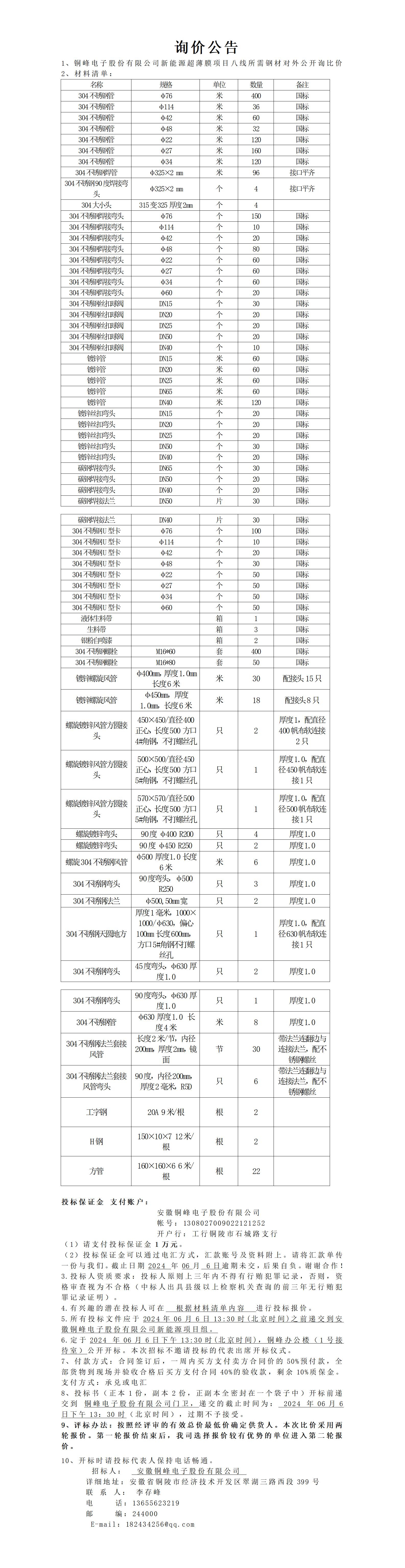 銅峰電子股份有限公司新項目八線縱拉、橫拉、電暈鋼材詢比價公告