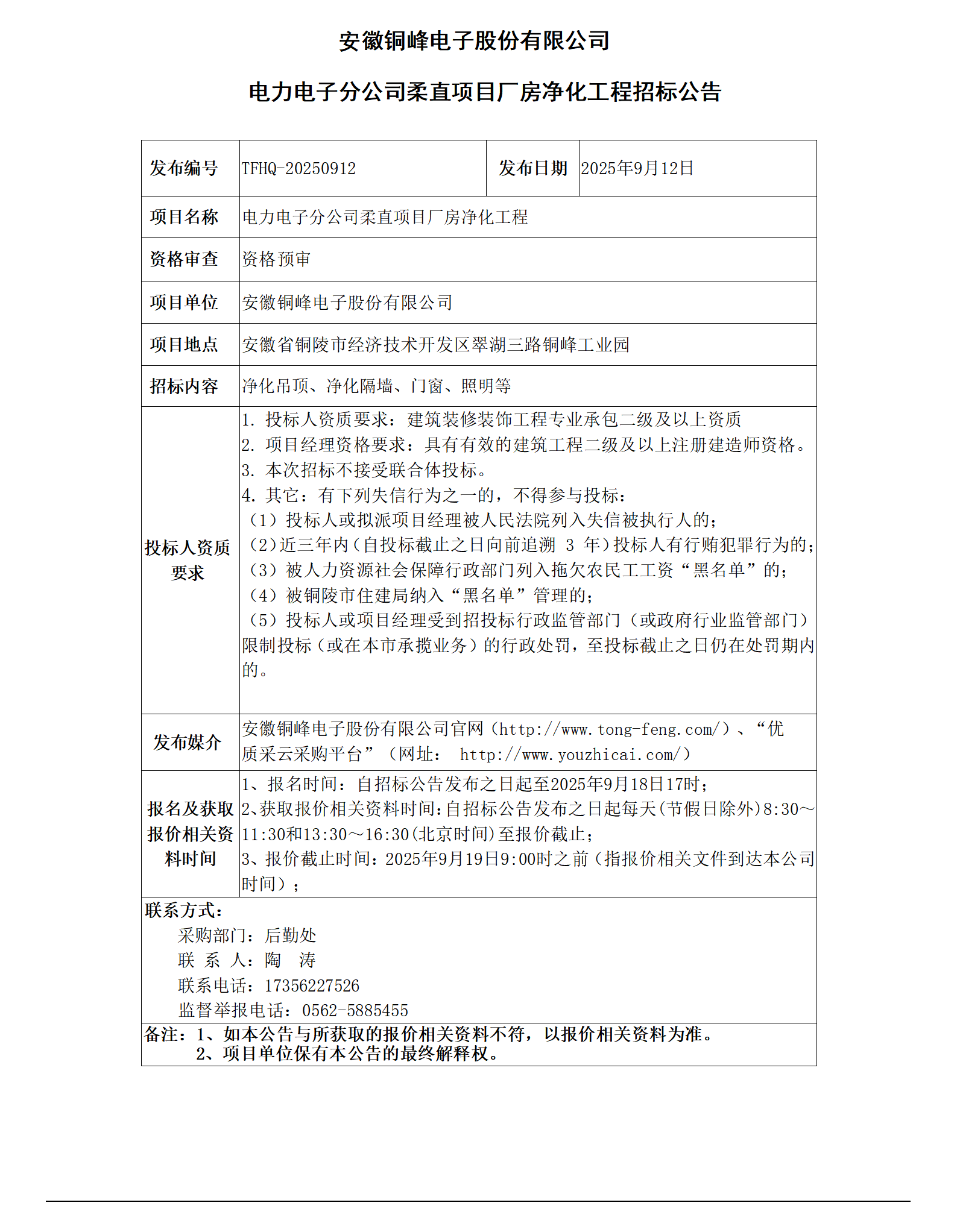 01安徽銅峰電子股份有限公司 (電力電子分公司柔直項(xiàng)目廠房凈化工程 招標(biāo)公告)_01