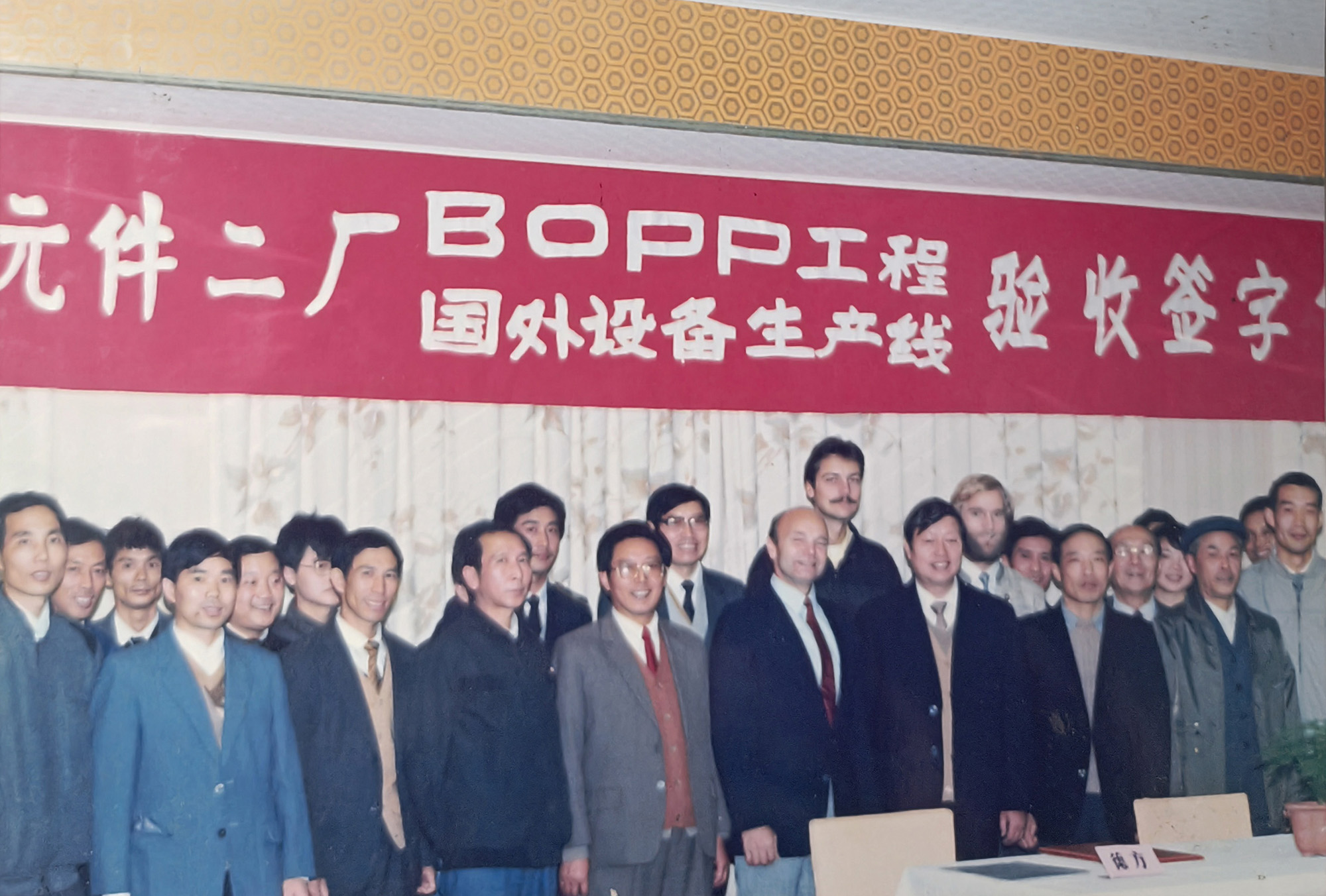 銅峰“老一線”于1989年建成投產(chǎn)。上世紀(jì)80年代,當(dāng)時國內(nèi)電容器用聚丙烯膜幾乎完全依賴進(jìn)口,嚴(yán)重制約了我國電容器等相關(guān)產(chǎn)業(yè)的發(fā)展。銅峰公司前身銅陵市無線電元件二廠積極響應(yīng)國家需求,決定從國外引進(jìn)雙向拉伸電容器用聚丙烯膜生產(chǎn)線。1985年項目啟動,經(jīng)過一系列籌備工作,1986年獲得國家計委批準(zhǔn)立項,并被列入國家 “七五” 機(jī)械電子工業(yè)重點(diǎn)技改項目。1988年,主線和相關(guān)輔助設(shè)備成功引進(jìn)。經(jīng)過一年多的緊張建設(shè),1989年生產(chǎn)線正式投產(chǎn)?!袄弦痪€”的建成投產(chǎn),是銅峰發(fā)展史上具有重要意義的轉(zhuǎn)折點(diǎn)。該線加速了銅峰公司產(chǎn)品結(jié)構(gòu)調(diào)整和轉(zhuǎn)型步伐,并由此形成了全國唯一的“電工三膜”(電容薄膜、金屬化膜和薄膜電容器)一條龍的生產(chǎn)格局,使企業(yè)的經(jīng)濟(jì)規(guī)模和技術(shù)水平躍上一個新臺階。