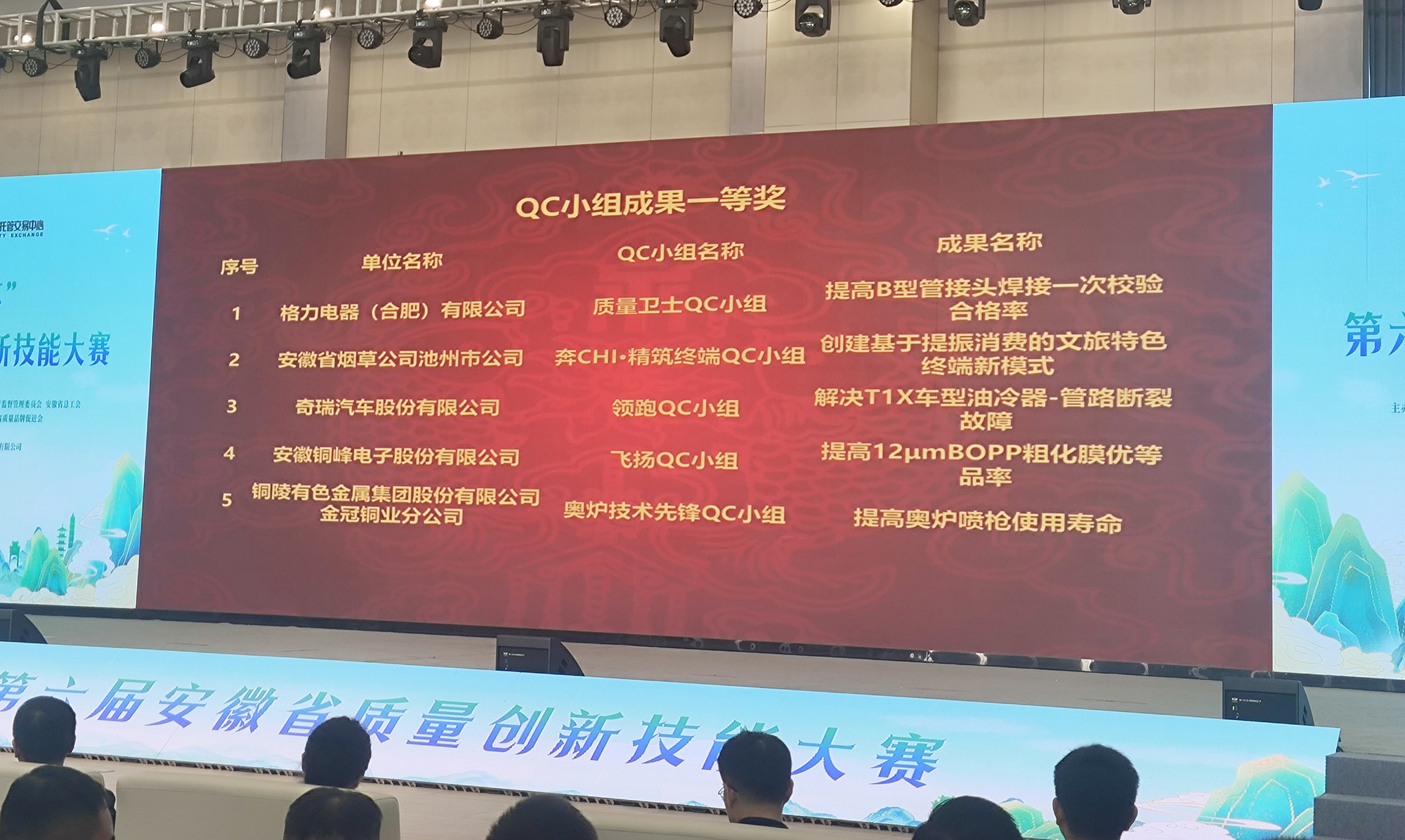近日,“歙采繽紛杯”第六屆安徽省質(zhì)量創(chuàng)新技能大賽在黃山市歙縣圓滿落下帷幕。公司在此次大賽中表現(xiàn)亮眼,三組參賽團隊歷經(jīng)激烈角逐全部斬獲獎項,分別榮獲QC成果一等獎1項、三等獎2項,以硬核實力彰顯企業(yè)質(zhì)量創(chuàng)新風采。