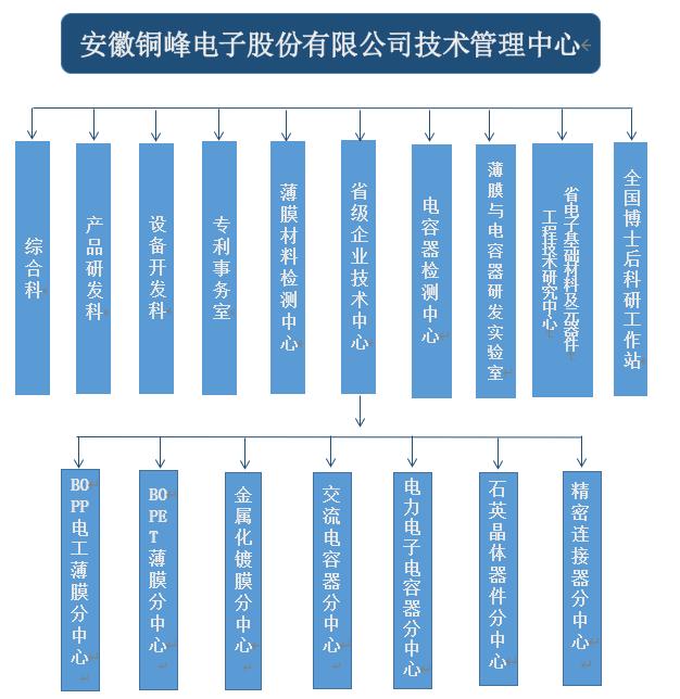 銅峰公司為國家高新技術(shù)企業(yè)、國家火炬計劃重點高新技術(shù)企業(yè)、國家火炬計劃銅陵電子材料產(chǎn)業(yè)基地重點骨干企業(yè)。公司建有完整的科研創(chuàng)新組織體系,設(shè)立技術(shù)管理中心作為技術(shù)研發(fā)的總管理機(jī)構(gòu),組織協(xié)調(diào)公司的各分子公司和相關(guān)部門,以確保公司技術(shù)創(chuàng)新精確高效地運行。技術(shù)管理中心下設(shè)綜合科、產(chǎn)品研發(fā)科、設(shè)備開發(fā)科、專利事務(wù)室、薄膜材料檢測中心、電容器檢測中心以及薄膜與電容器研發(fā)實驗室,同時下設(shè)省級企業(yè)技術(shù)中心、安徽省電子基礎(chǔ)材料及元器件工程技術(shù)研究中心以及國家級博士后科研工作站。